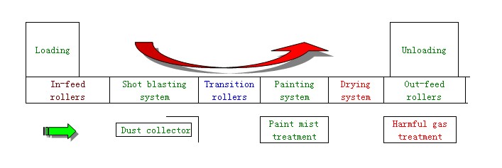 The blasting part adopts centrifugal high-efficient blast wheel, mechanical and continuous abrasive handling and reclamation. The cleaning part adopts high quality rotary brush and high pressure blower blow off. Automatic spray painting system adopts high pressure airless spray methods. The preheating and drying part adopt various heating methods, such as electric and gas etc. The complete automatic system is controlled by PLC with full interlock safety system provided.