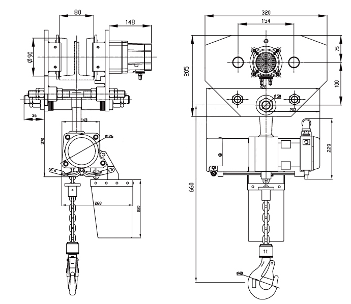 Sketch of 1T Pneumatic Chain Hoist with Trolley
