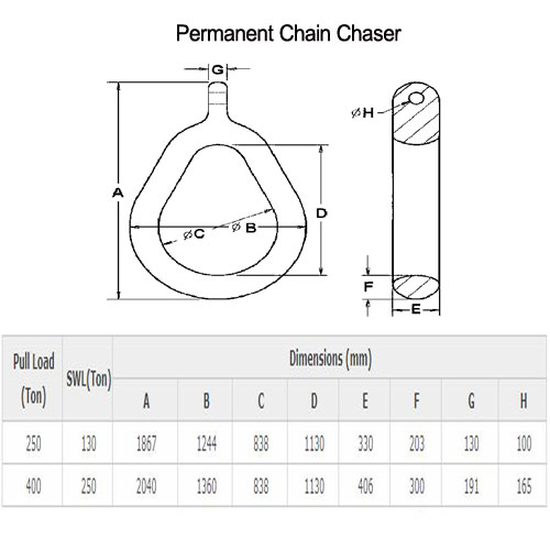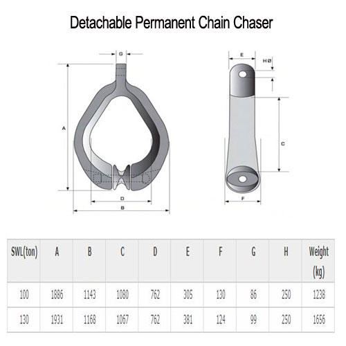 The chain chasers have different shapes and sizes in order to suit different need of mooring system. It can handle anchors up to 30 ton and stud link chains up to 4 ½ inches in diameter.