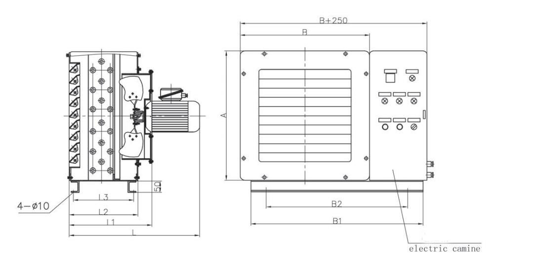 The CNF (D) electric heating series heater consists of an electric heater, an impeller, a collecting ring, a motor, and an electric control box. The electric heating tube of the electric heater is wound around the stainless steel tube by mechanical winding. The impeller adopts LF3 anti-rust aluminum; the casing and the electric control box are welded by ordinary steel plate or stainless steel plate. According to the needs of the user, the electric control box can be assembled with the heater body or separately. The electric heating heater has over-temperature protection, overload protection, temperature control, interlock control of fan and electric heating heater, and hierarchical control electric heating function.