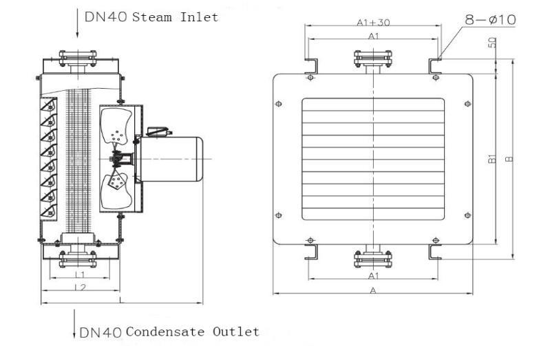 The CNF (Z) steam series heater consists of a heat sink coil, an impeller, a Wind circle, and a motor. Heat pipe, the heat dissipating fin adopts a mechanical winding method, which is wound around the heat pipe (can also be used as needed). The heat radiating fins and the heat pipe have a wide and tight contact surface, thereby improving heat transfer performance and working pressure, and the heating medium is generally 0.3MPa saturated steam, the highest saturated steam working pressure is 1.0 MPa, the impeller adopts LF3 anti-rust aluminum, the casing is welded by ordinary steel plate or stainless steel plate.