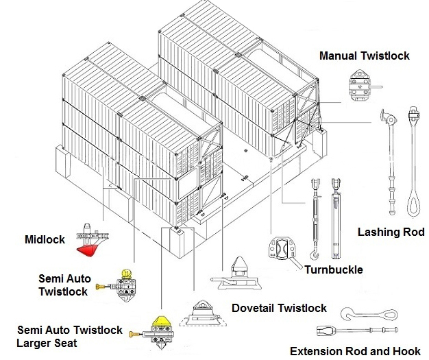 D-ring, Lashing plate, Raised ISO foundations, Dovetail foundations, Flush sockets, Sliding foundations, Guide cone, Guide block, Turnbuckles, Lashing rods, Extension rods, Manual twistlocks, Semi-automatic twistlocks, Midlocks, Sliding twistlocks, Bridge fittings, Single stackers, Double stackers, Hanging stackers, , ETC.