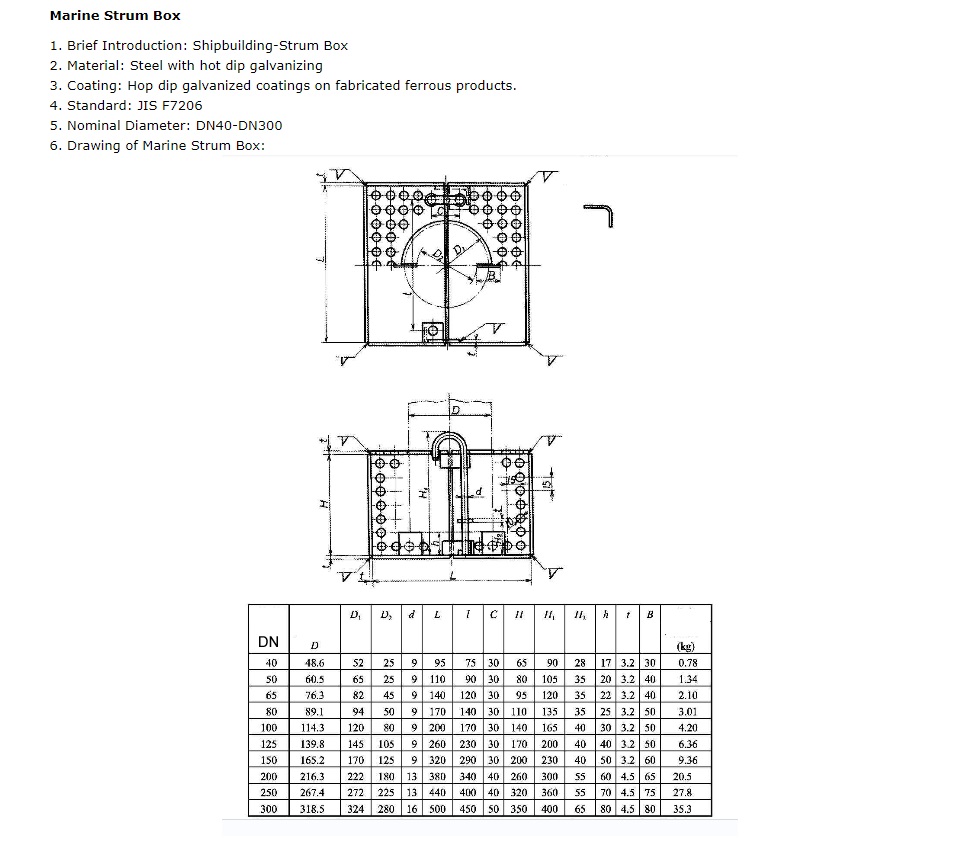 The material of the filter box is carbon steel, the ratio of the total area of the filter hole to the nominal diameter area of the suction pipe is greater than 3, and the ratio of the area of the filter hole to the area of the orifice plate is greater than 0.3 The filter box shall be hot-dip galvanized after processing and forming, and the surface adhesion shall not be less than 600g / m2