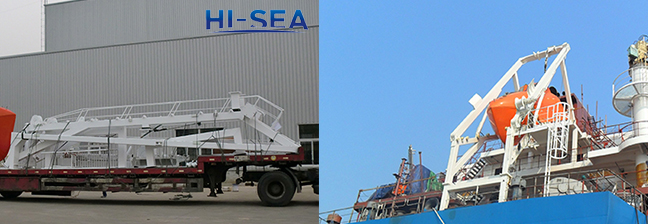 The Freefall Davit placed at the stern of the ship consists of a launch ramp davit arm, winch and hydraulic unit. This device can make lifeboat freely land to water surface in an emergency or under the circumstances of trim 20¡ãand list 10¡ã. It meets requirements of International Safety of Life at Sea 1974, IMO, MSC. 81(70) and other regulations.