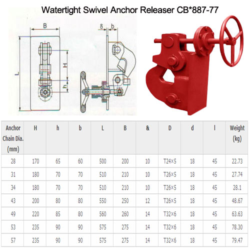 Various Types of Anchor Releaser: Simple Type, Screw Type, Plug Type, German Standard Type. There are different shipbuilding industry standards of anchor releaser. We can both supply all the standard products and customize new products according to our customer¡¯s requirement.