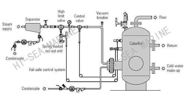 This calorifier can be combined to use with hydrophore on board, that is to use water in hydrophore to replenish this tank, and then heated by electric or steam heating elements for usage of entire vessel.