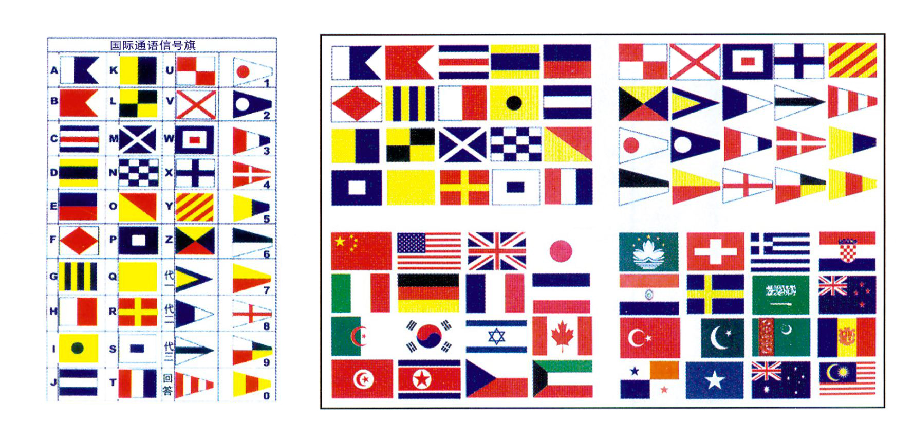 International signal flag is a kind of flag communication system between ships to let other ship fastly clear the intentions. This system is part of the International Code of Signals. It is made of exlan bunting (synthetic fibre), and can be ordered individually or as complete sets. The sets including 26 alphabet flags, 11 pennants (10 number and 1 answering) and 3 substitutes.