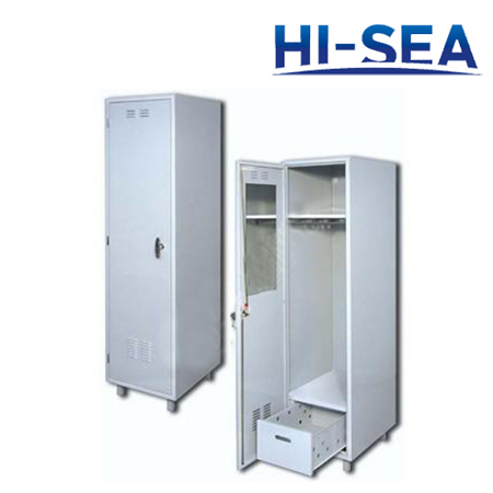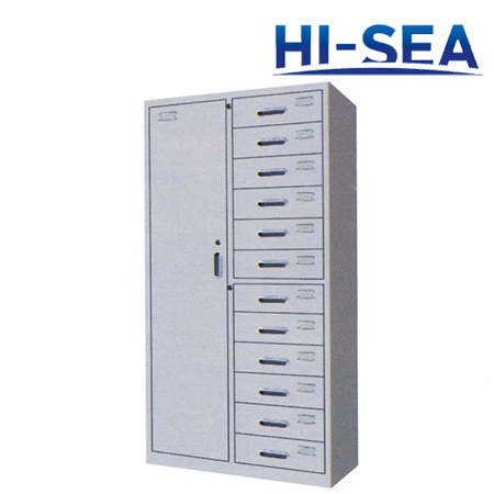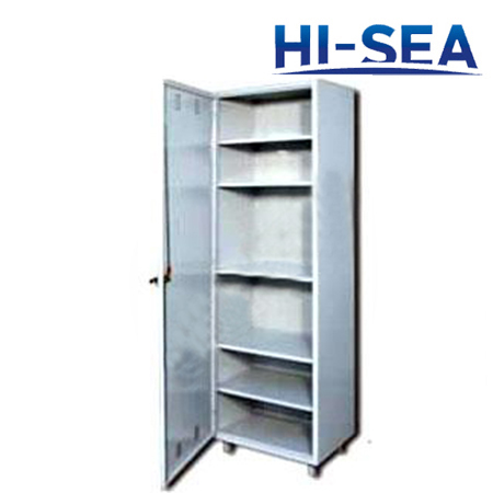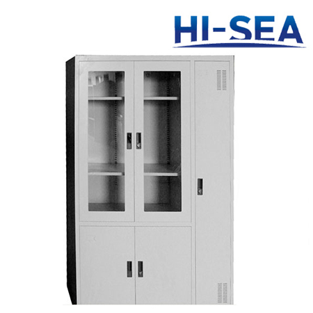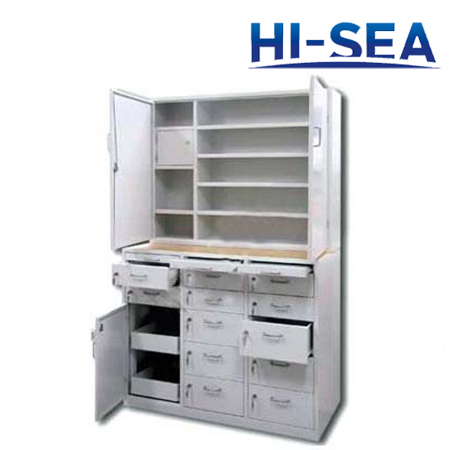 Marine steel medicine locker is specially fit for boats,ships and vessels. The material of this locker is steel.It has anti-rust feature.This medicine locker is made from two parts.The lower part of the locker have drawers with key lock and three trays with milky glass for preparation of the medicines.The top of the lower segment is covered by laminate which is wood structure.The upper part is constructed for storing the medicines in wooden racks with additionally safe-deposit box.All drawers and doors are equipped with locks in ¡°master key¡± system.