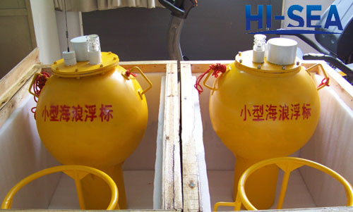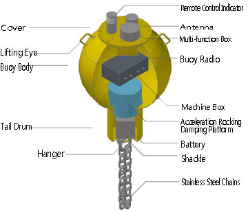 This wave buoy is composed of an accelerometer, a voltage frequency module, a radio etc.. With the wave motion of the wave, the output of the accelerometer is converted into a V/F, whick is transmitted back to the shore station in time.