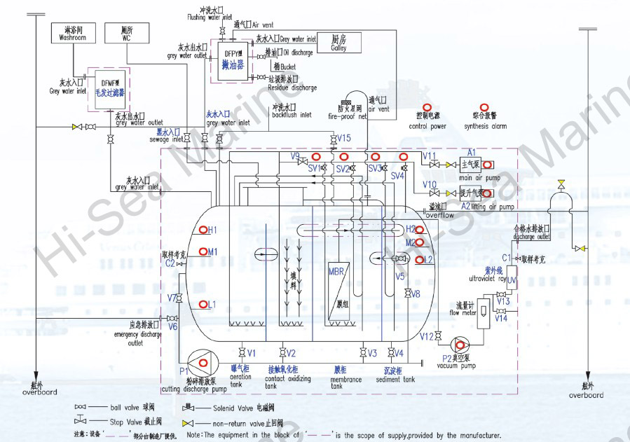 This plant is applicable to treat the sewage, which means human body wastes and the wastes from the toilets on vessels and which is also called ¡°black water¡±, to meet the effluent standards of IMO MEPC.159£¨55), and discharge the effluent to overboard. It is also applicable to treat galley & shower drainage which is called ¡°grey water¡± .