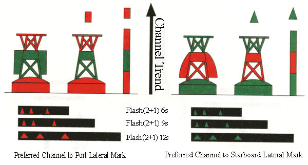 Preferred channel marks are set at the turnoff of the channels. It also can be set at the specific channels. When a ship sails along the channel, the port lateral mark recommends that the preferred channel or specific channel is at the markĄ¯s right side; the starboard lateral mark recommends that the preferred channel or specific channel is at the markĄ¯s left side.