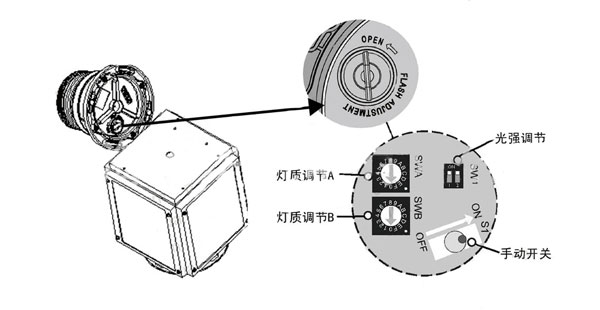 1. Open the lid of the box on the four screws; take the lamp and then open the rotating plug according the the OPEN direction of the rotating plug on the lamp bottom; then you can see the manual switch, light intensity adjustment and characters adjustment device.
