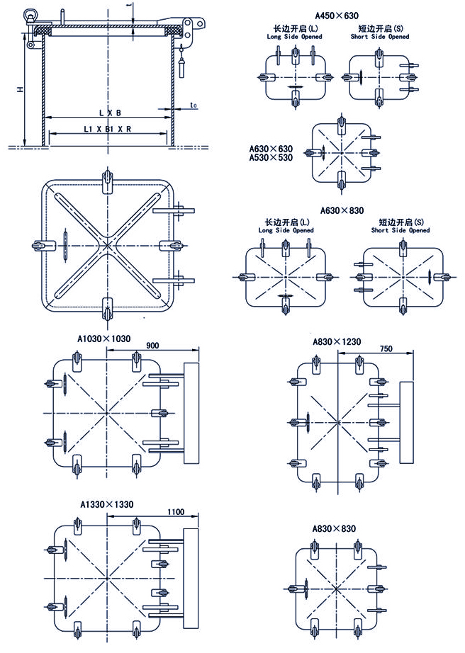 It is a weathertight hatch cover which is opened at a fixed side. This hatch cover is suitable for various ships. It is made of steel and equips with butterfly clips. Hinges can be mounted on the long side or short side of this hatch cover according to your requirements. The installation of anti-piracy lock is optional. There are two shapes: square and rectangle. A full selection of hatch cover specifications is available. This small hatch cover is designed and manufactured in line with the standard of CB/T 3728-2011, so you can trust product quality. Welcome to contact us for more information.