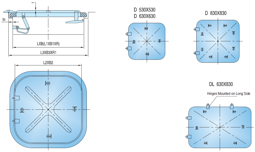 It is a kind of hatch cover used for applications where frequent access is required. This small hatch cover is flush type and has the weathertight function. There are two shapes of the steel small size hatch cover type D: square and rectangle. We provide various cover specifications to meet your exacting requirements. Customization is available. All products provided are approved. Excepting this type, we also supply steel small size hatch cover type A, B, C, E, F. If you are interested in our products, please contact us.