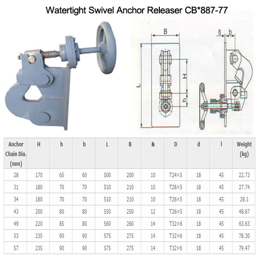 We supply two standard types swivel type anchor chain releaser: CB*289-81 anchor releaser and CB887-77 watertight swivel type anchor releaser. If you have special requirements about the products, we can supply customized products for you. For more detail information, please feel free to contact us.