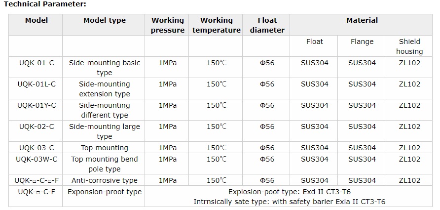 UQK type float level controller is widly used in ship, chemical industry and other industrial equipment to control and alarm the level in tank by two position type.