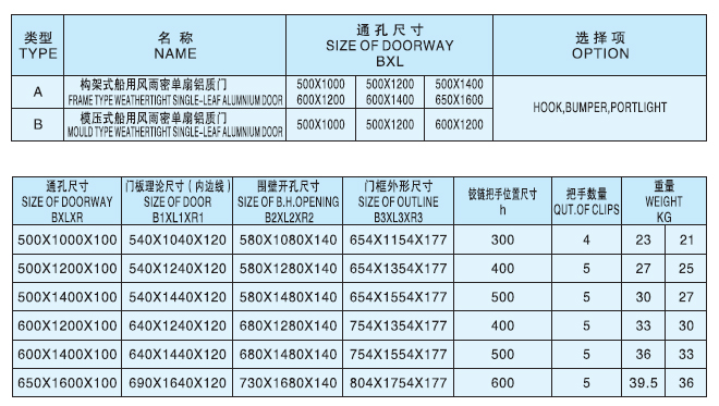 This door is used on the casing walls of ships. It is installed on the place where weather conditions do not require the heavy watertight steel door, so a light weathertight aluminum door is sufficient. The opening direction of the door is left outward opening. This door meets the standard CB/T 454-1997. There are two types: type A and type B. Type A is frame type weathertight single-leaf aluminum door; type B is mould type weathertight single-leaf aluminum door.
